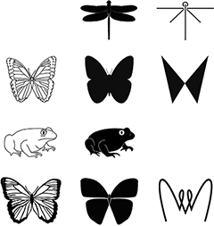 Linien in vier visuellen Rythmen: locker-belebt, meditativ-entspannt, zügig-mechanisch, hektisch-panisch (weiße Papierstreifen in geschlitztem schwarzen A5-Tonpapier)